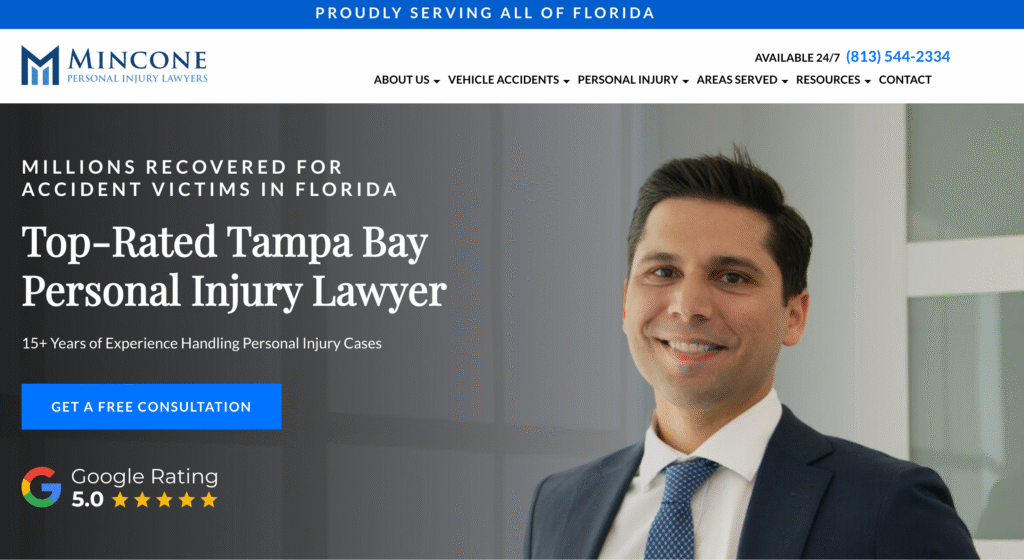 This template is used by Mincone Personal Injury Lawyers, a premier personal injury law firm in Tampa, Florida, dedicated to helping injury victims recover compensation after accidents. We created a mobile-responsive, content-rich website that supports a large number of practice area pages, from car and truck accidents to slip-and-fall and wrongful death, all organized in an intuitive, user-centric structure. Every page is optimized for performance and clarity, highlighting the firm’s experience, services, and commitment to client care.